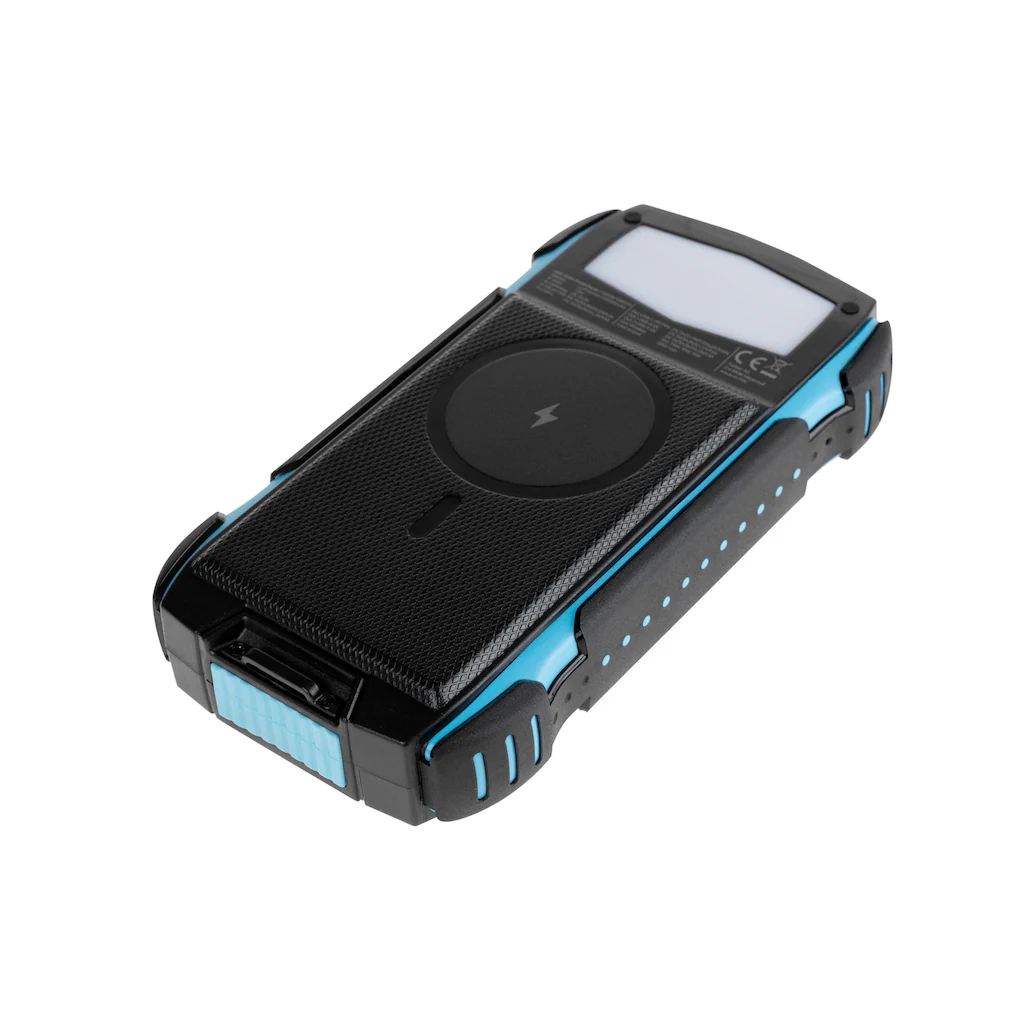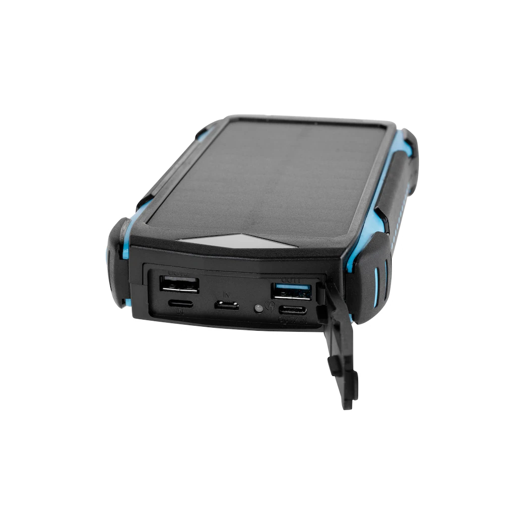 Robuste und wasserdichte Powerbank mit Qi-Charger, Solarpanel und LED-Leuchte